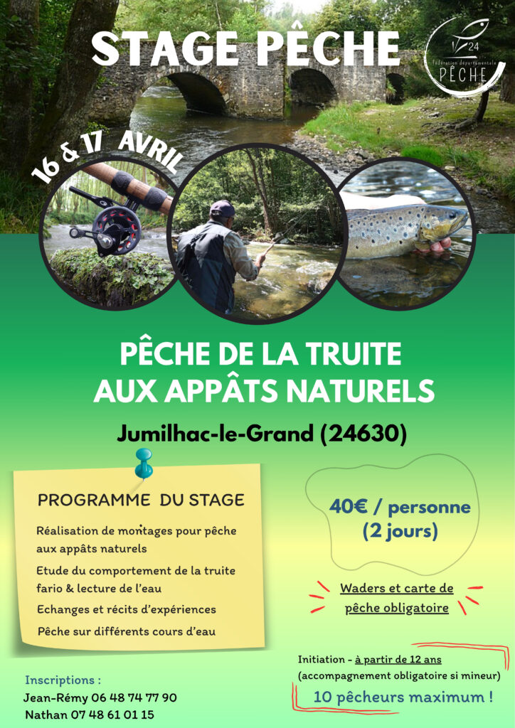 Le soleil revient… et les stages pêche aussi ! Envie de progresser, de découvrir de nouvelles techniques ou tout simplement de passer un bon moment au bord de l’eau ? On vous donne rendez-vous dans le superbe Périgord Vert, à Jumilhac-le-Grand, pour deux journées immersives en petits cours d’eau. Les 16 & 17 avril 2026 à Jumilhac-le-Grand Groupe limité à 10 participants Un cadre exceptionnel, des conseils personnalisés… et quelques jolis poissons en prime (si vous êtes sages ). Les places sont très limitées, alors ne laissez pas filer votre chance ! Réservation et infos sur l’affiche !!
