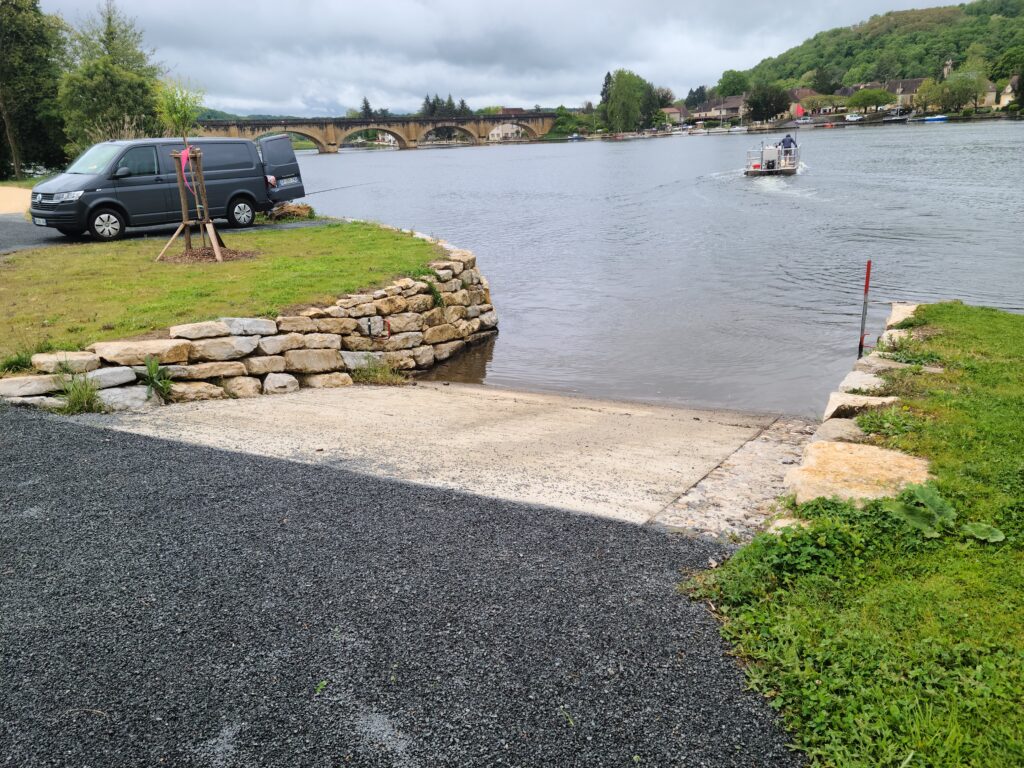 En rive gauche de la rivière Dordogne, 250m en amont du pont ferroviaire, commune de Calès au lieu dit “Port de Mauzac”.